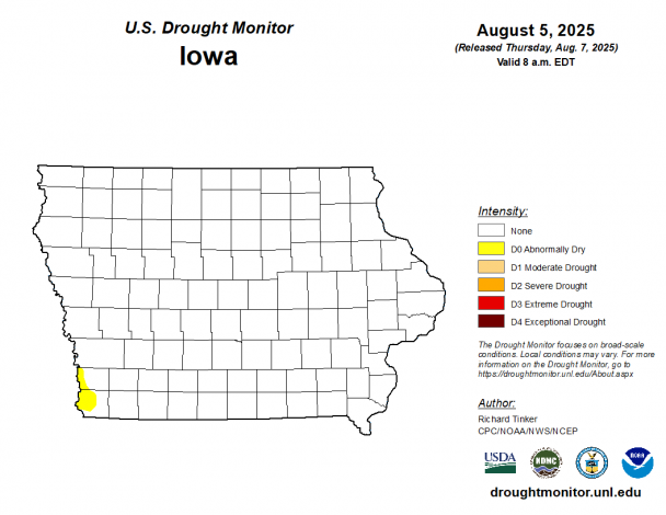 According to Iowa’s Drought Plan, overall drought conditions improved for the entire state. The drought watch designations for portions of western and southern Iowa have been lifted, and all drought regions now carry a normal drought designation. According to the current U.S. Drought Monitor (USDM), less than one percent of Iowa continues to experience abnormally dry conditions.
