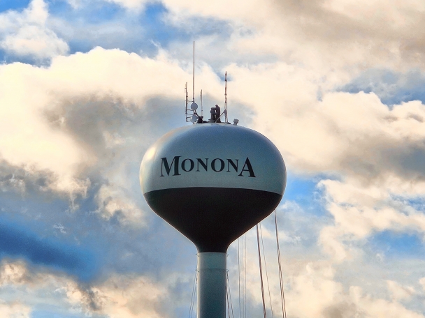 Workers could be seen on top of the water tower in Monona last Thursday night. They are painting the inside of the tower. (Destiny Kapler/The Outlook photo)